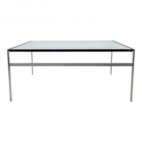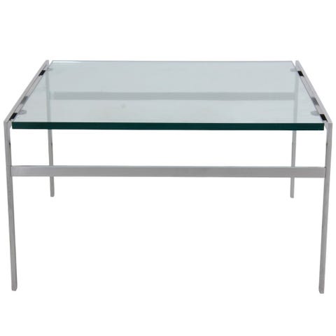 Fabricius og Kastholm sofa bord model BO-550 med glasplade, og stel af stål. Stellet skal slibes/forkromes men pladen har ikke afslag men ridser.