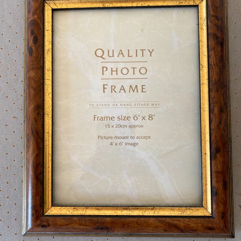 Ny og ubrugt ramme i "guld" og glas. Ydermål: 25x34 cm. Indermål: 20x29 cm. Billedramme i plast der ligner træ og har rigtig glas. Kan hænges lodret eller vandret. Ann. nr. T941