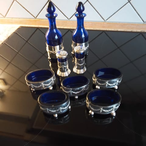 Salt pebersæt med sølv låg, Glas sølv, Ved ikke om det er pletsølv men fine er de