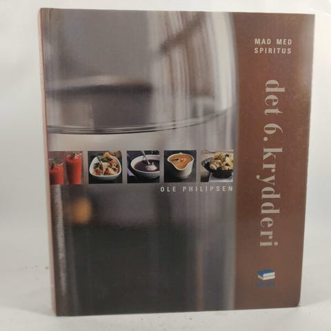 Det 6. krydderi - Mad med spiritus, Ole Philipsen, emne: mad og vin, Hardbacken er ubrugt og derfor som ny indvendigt. Udvendigt er den i pæn stand. Den har dog fået et svagt tryk øverst ved det ene hjørne (se billede 7).