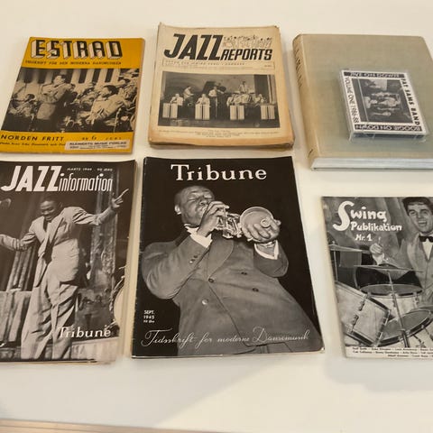 Bøger og blade, Jazz blade, Rigtig fin samling ældre Jazz blade. Jazz Reports fra 40’erne 6 stk. bl.a. nr 1 fra maj 1941. Jazz bladet 9stk. Indbundet i hardback 3. Årgang fra sep.1959 til maj 1960. Musikrevue 44. Stk. Hele Årgange 1954-1955-1956-1957 og 1958. Alene disse herlige Jazz blade sælges samlet. Eller byttes til danske Beat og Rockblade fra 60 og 70’erne.