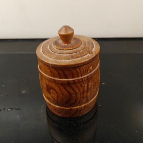 Træ krukke, Gammel vintage tobakskrukke i træ. Trækrukke med låg, i fin stand, været brugt til knapper