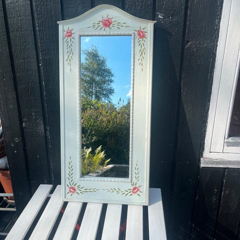 Spejl, Rigtig skønt gammelt spejl. Måler ca 38x48 cm udvendigt mål. Flot på en billedvæg blandt andre rammer. Der er ophæng på begge ledder bagpå. Intakt og i pæn stand. Sendes ikke.