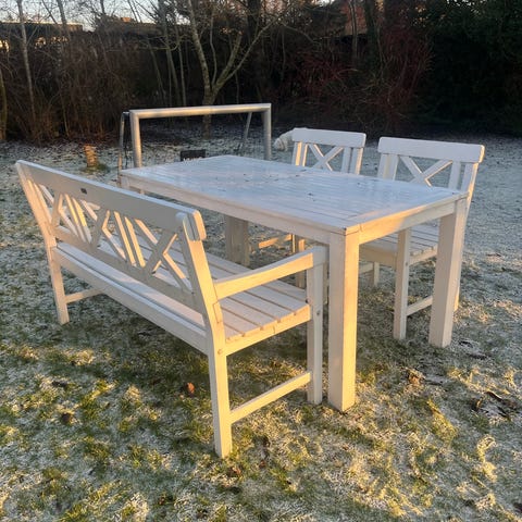 Terrasse møbelsæt, af smedejern i fransk inspireret stil. Flot og stilfuldt til en terrasse eller udestue. Består af bord 80 x 160 cm, sofa til 3 personer og to armstole. Stellet er sandblæst og pulverlakeret i antracit grå og fremstår som nyt. Bordplade er i træ og kan eventuelt let udskiftes til andet materiale. Hvide siddepuder kan medfølge.