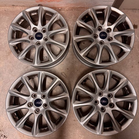 Alufælge, 16", andet mærke, krydsmål 4 x 108, ET 47,5, Standard Ford fælge, der skal nye dæk på da de andre er slidt ned.