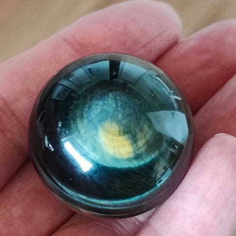 Den forandrer ligesom udseende efter, hvordan den drejes i lyset. Mønstrene der ses er ikke faste, men forandrer sig hele tiden, når kuglen drejes i solen/lyset.