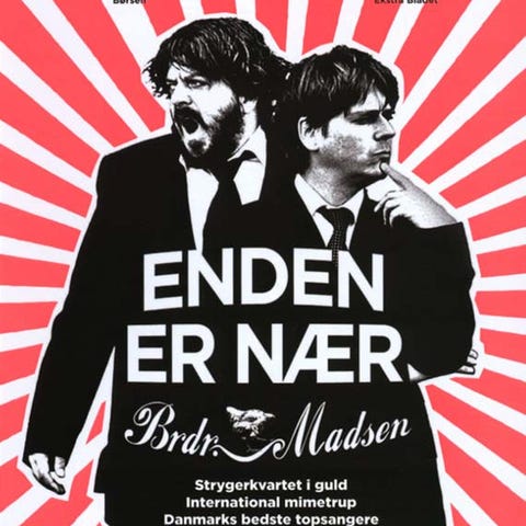 Brdr. Madsens anmelderroste, festlige og musikalske Dommedagsshow handler om katastrofer, kamtjatkakrabber og sindets dunkleste afkroge. Udgangspunktet er naturligvis videnskabeligt, og der er selvsagt masser af dejlig musik og spas og faldera til at bløde op på de allerværste passager. Og allervigtigst af alt: Det hele ender heldigvis godt. Udover selv at stå på scenen har Peter Lund Madsen og Anders Lund Madsen skrevet teksten til Enden Er Nær, og de er akkompagneret af Strygerkvartet i guld, den internationale mimetrup Das Fleischkvartet des Bielefelds samt Danmarks bedste topsangere Martin Ullits Dahl og Billie Koppel. Maria Vinterberg har instrueret, og scenografi en er lavet af Marianne Nilsson. Musikken er komponeret af Teitur og Bent Fabricius-Bjerre.