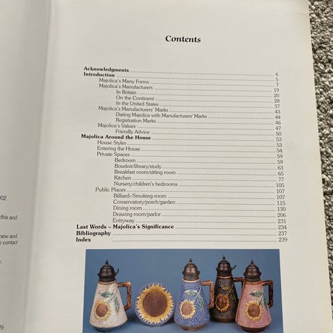 Forfatteren har inkluderet detaljerede tekstbehandlinger af alle identificerbare producenter af Majolica, samt en værdivejledning for alle stykker vist i bogen.