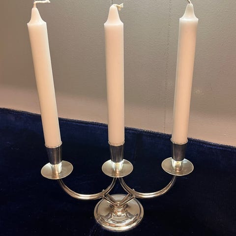 2 3-armede lysestager, Kandelabre. Antikke i sølvplet - med stempler. Virkelig smukke skal nok pudses. Lysmanchetter er aftagelige. Højde 25,5 bredde 31.