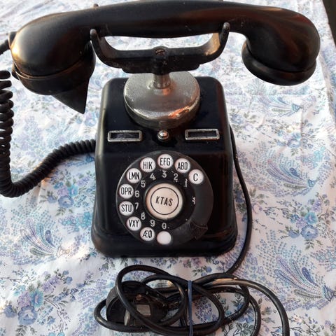 Ældre sort KTAS telefon i jern og bakelit med drejeskive og intakt ledning og stikprop.