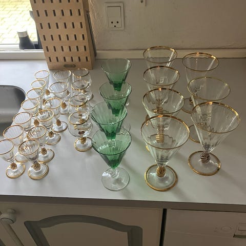 Glas, Hvidvin, Ida Holmegård grøn hvidvin, Smukke gamle Ida hvidvin glas fra Holmegård, designet af Jacob Bang. Højde 12,5 cm. Ingen skår, pest eller revner, men en smule brugsslitage på guldet.
