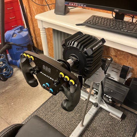 Fanatec, spillekonsol, Perfekt, Racing simrig, komplet med Fanatec CSL Elite F1 rat & pedaler, skærm, computer, racing sæde. Monteret på kraftig aluramme. På hjul med lås så rammen nemt kan flyttes,