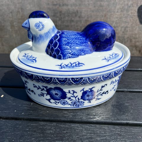 Porcelæn, Terrin, HK import, Skål med låg. Hvid med blåt blomstermønster. Håndtag som “muslingeskaller”. D = 20cm. H = 16 cm. Afhentes på Nørrebro efter aftale.