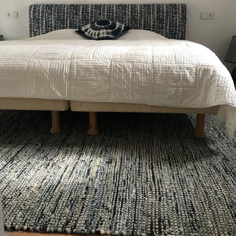 vendbart design, det giver et lysegråt indtryk på øjet når det ligger på gulvet. Læder glider ikke rundt på gulvet som almindelige bomuldstæpper.
