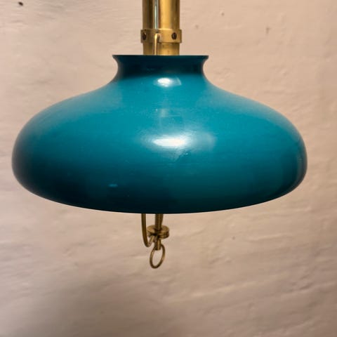 Pendel, Tilskrevet Lyfa, Flot retro lampe fra 60'erne med okseblodsfarvet skærm der er hvid inden i som hænger i 3 ledninger fra lofts manchet. Pæren omkranser af matteret glas med striber som er intakt. Der er en tænd/sluk knap under lampen. Den er tilskrevet Lyfa og er 72 cm fra loft til bund af lampe og 43 cm i diameter. Skærmen har en smule patina, men ingen store ridser. Trænger til en kærlig rengøring. Sidste billede er et lånt billede fra auktionshus. Kan afhentes i Horsens eller Risskov
