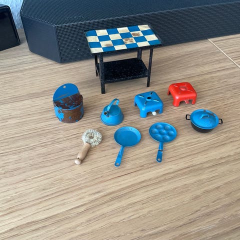 Dukkehus-møbler, tekno møbler, retro tekno dukkehus møbel sæt for stor til lisa og lundby dukkehuse bord og 2 stole den ene er limet og 1 defekt stol se billederne meget gammelt fra gemmerne kan sendes med dao + porto eller afhentes Egtved forstør billederne
