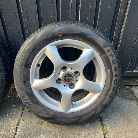 sommerdæk, Firestone, fælge med dæk, 4 brugte dæk, 1 ny dæk