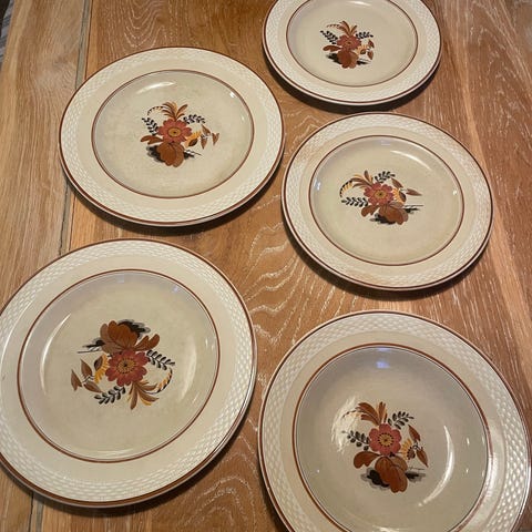 To flade middags tallerkener fra Aluminia, Knud, designet af Nils Thorsson.