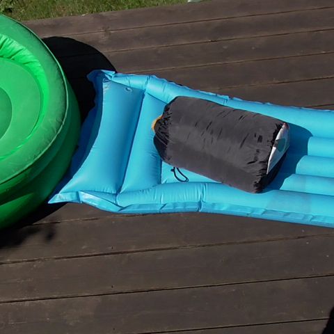 Sovepose og selvoppustelig liggeunderlag samt skammel, perfekt til festival. Brugt en gang