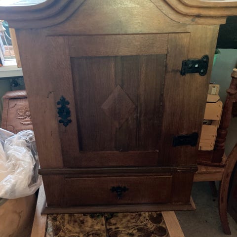 Større hængeskab, b: 65 d: 34 h: 62, Gammelt vægskab som min farfar har malet/dekoreret i hånden tilbage i 50’erne eller 60’erne.