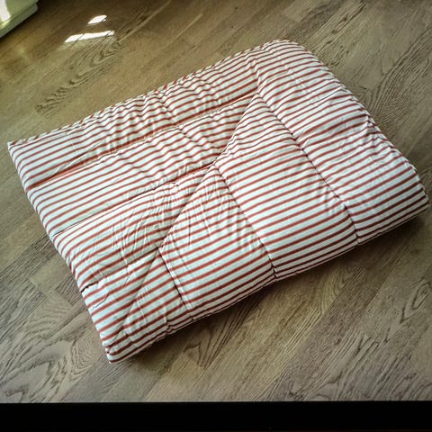 Tyk vattæppe / Sommerdyne, RETRO, 2 siddet med lys bund med blomster deco, lyse røde roser på den ene side og rosenknopper på den anden. Grøn kantbånd. 200 x 135 cm. Vask 40 grader.