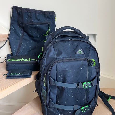 Satch Pack ergonomisk skoletaske. Aflaster ryggen takket være dens aftagelige brede hoftebælte med "Pull-forward-system. Via Your-Size-System kan den justeres præcist til enhver højde mellem 1,40 m og 1,80 m. Den indvendige opdeling giver masser af plads, samt mange organisationsmuligheder. Tekstilerne er PFC-Fri og er fremstillet af 100% genanvendte PET-flasker. På denne måde kan plastaffald anvendes på en helt ny måde.