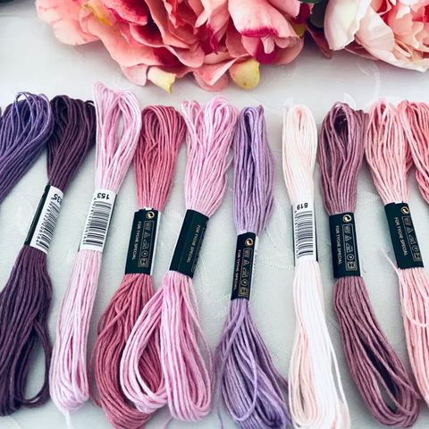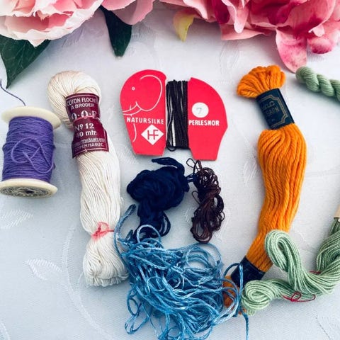 Pose med blandede rester af broderi- og stoppegarner. En del rødt (to nuancer). Fire hele fed / bundter. 55 gram i alt.