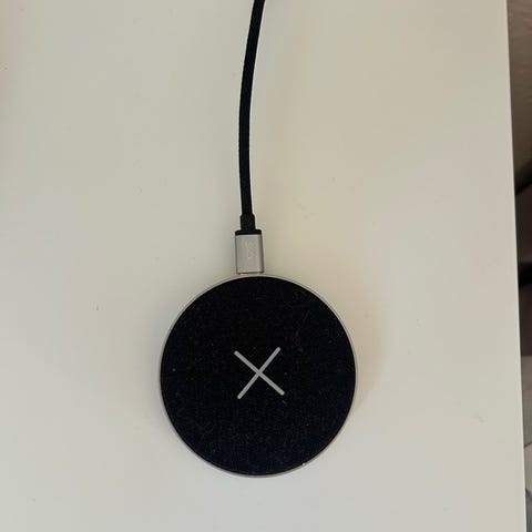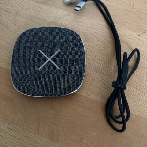Oplader, t. andet mærke, Sacit, God, Da jeg har tabt mine sackit høretelefoner, så sælger jeg mit etui + tilhørende trådløse oplader som bruges til at oplade etuiet. Opladeren kan også bruges til at oplade din mobil ved at lægge mobilen ovenpå. Jeg har brugt den til min egen iPhone 12 Mini uden problemer.