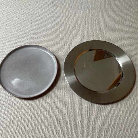 Rundt: diameter 25 cm, højde 2,2 cm, vejer 851 gr.