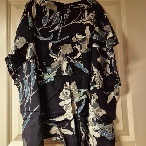 Pas let mønstret superflot kjole/tunika str 38. Brystvidde ca 2 x 47 cm. Længde ca 93 cm. Materialet er meget let, dog ingen oplysning om materiale