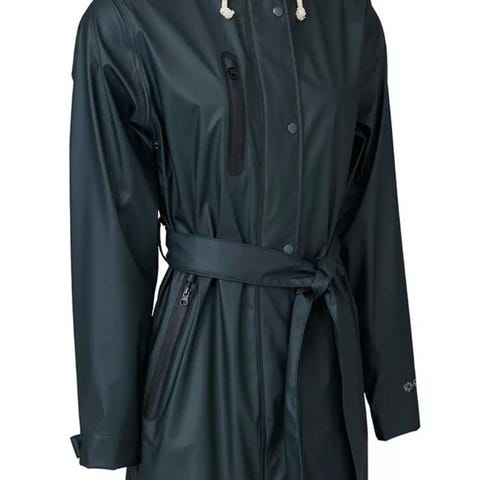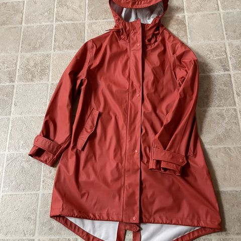 Regnjakke, str. 52, àhkkà, Rød m lilla for og orange piping, Kunst, Næsten som ny, Nypris 1099,- Ingen slitage for kun brugt ganske få gange, for jakken er lang og desværre for stram over måsen til mig.