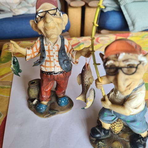 Andet, Ældre tysk porcelænsfigur med en stolt lystfisker. Fiskeren står med stang og fanger og fisketasken på skrå. Figuren er 27 cm høj og er I meget flot stand uden skader. Den er fremstillet I porcelæn af høj kvalitet og er mærket med producentens logo, der er en blå krone. Står på Mols men kan gratis leveres I Aarhus og Ebeltoft eller sendes billigt på købers regning