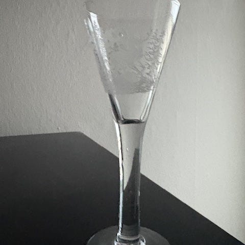 1 Antik glas / Spidsglas med cicelering af Kronhjorte, H 14,2 cm indeh. 5 cl., 375,-