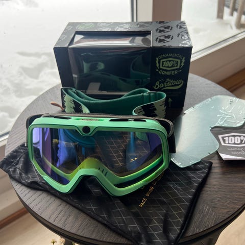 Indeholder briller, tekstil opbevaringspose, elastisk brillerem samt et ekstra sæt gule glas udover de standard monterede røgfarvede.