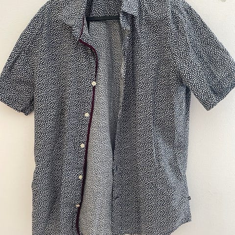 Fin skjorte i kunststof med slåede knapper,skulderpuder og slidser i siderne.