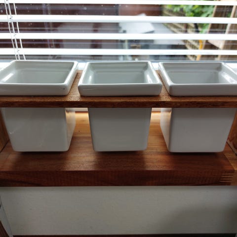 Plint med tre potter, Trip Trap, træet trænger til en slibning og olie.