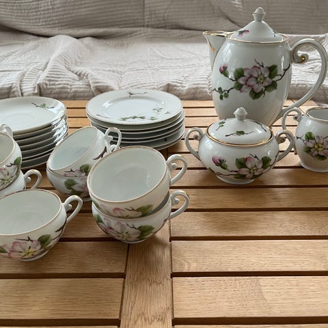 Charmerende kaffestel til 6 personer, fra midten af århundredet, bestående af kopper, underkopper og kagetallerkner.