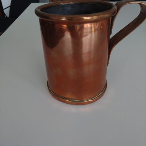 Kobberkrus, ?, Kobberkrus nittet, med patina. Kruset er 20 cm højt, diameter foroven 10 cm og diameter forneden er 10,5 cm. Kruset vejer 1.120 gram. Fast pris. Jeg sender gerne, hvis du betaler portoen.