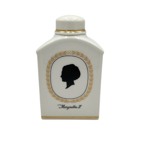 Porcelæn, Thedåse, Kgl Porcelæn, Lille thedåse med motiver af Juliane Marie og Magrethe II. Royal Copenhagen Thedåse Juliane Marie Margrethe II No. 12440
