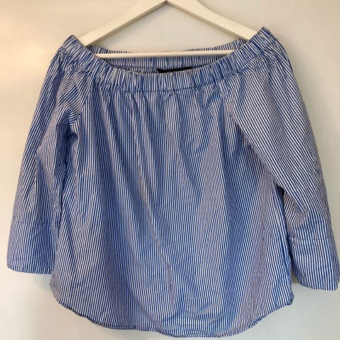 Langærmet stribet bluse fra Zara i blå/hvid i str. large, blusen er med turtleneck og lidt tætsiddende, kvaliteten er polyamid og elastan.