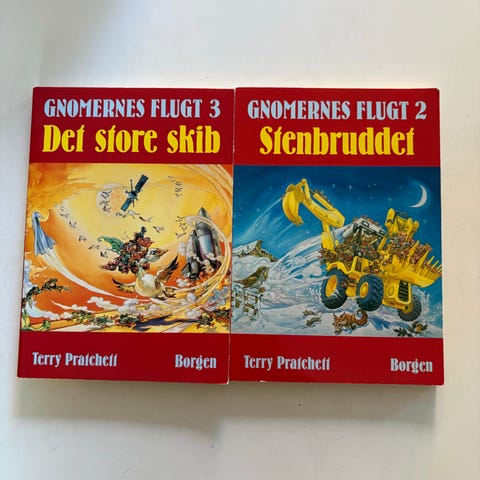 Gnomernes Flugt (samleroman), Terry Pratchett, genre: fantasy, Udgivet af Borgen i 2007 i 1. udgave, 1. oplag. Komplet trilogi samlet i en bog.