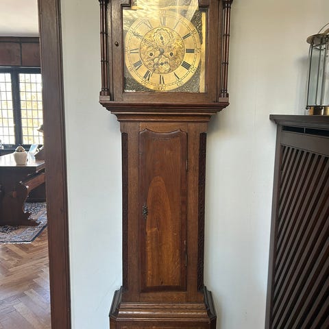 Standur, Edinburgh, Standur. Engelsk. Fra 1800 tallet. Mahogni kasse. Messing urskive. Sølvskive med indgravering. 213 cm høj