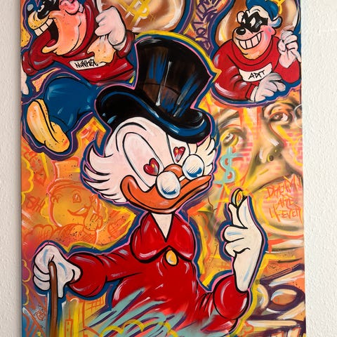 Blandede medier, Jannie Jørgensen, motiv: Abstrakt, stil: Pop Art, b: 40 h: 40, To cool malerier skabt af Jannie Jørgensen i 2000. Det ene med de to kvinder hedder: "Ladies with ...". Det andet værk hedder: "Viberationer". Fælles for værkerne er de gule,brune og gyldne farver, der passer i de fleste hjem. De er malet på en ramme, der er 4 cm bred, som er helt gylden. I år 2000 kostede de 1500 kr./stk. Jeg sælger dem for bare 275 kr./stk. eller dem begge for 450 kr. Det er billigt for ægte original kunst.