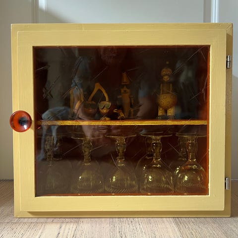 Andet skab, Fint skab i træ med tre låger, hvoraf det ene er i farvet glas. Kan skilles ad i over- og underdel. Der er lavet enkelte huller i bagpladen for at kunne trække kabler. Træsort og alder er ukendt.