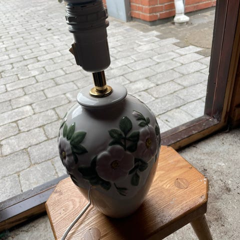 Lampe, Dekorativ bordlampe med hvide blomster.