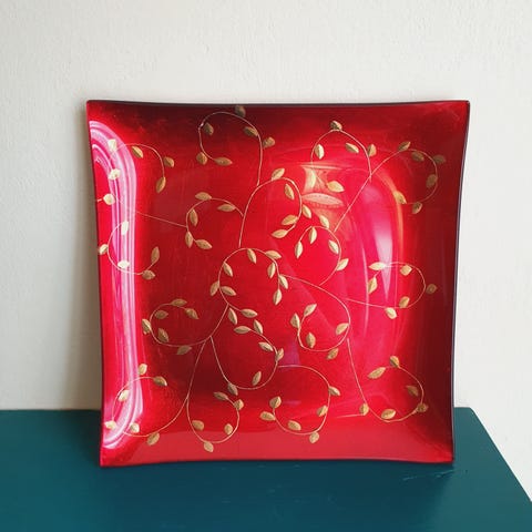 Rødt lysfad / julefad / juledekoration / rødt glasfad / rød glastallerken / julepynt / firkantet tallerken / glas fad / glas tallerken.