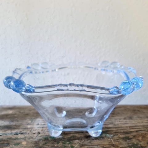 Glas, Lysestage/skål, Bergdala glasbrug, Vintage lysestage/skål fra 1970’erne. Bergdala glasbruk Sverige. Klar og ravfarvet glas i smuk åkande agtig udformning. 7,8 cm høj og 11,5 cm i diameter i toppen. 7 cm i diameter i bunden.