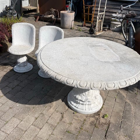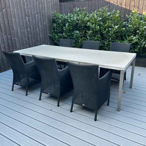 Havebord, Ukendt, Galvaniserede jernstole beton bord, Kan stå ude hele året - støbt beton bord 120 cm med skiffer sten. 9 stole af galvaniseret jern med grå lakering og hårdt træs sæde.