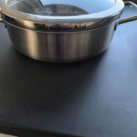 Grillpande, Kitchen Aid, Super grillpande fra Kitchen Aid. Fremstillet I støbt aluminium med antistickbelægning og med håndtag af rustfrit stål. Måler 27 x 27 cm (plus håndtag) og er I fin stand uden skader på belægningen. Passer til alle typer komfur inkl induktion, idet der jernkerne i det støbte aluminium. Forsynet med hældetud på begge sider. Står på Mols men kan gratis leveres I Aarhus og Ebeltoft eller sendes billigt på købers regning