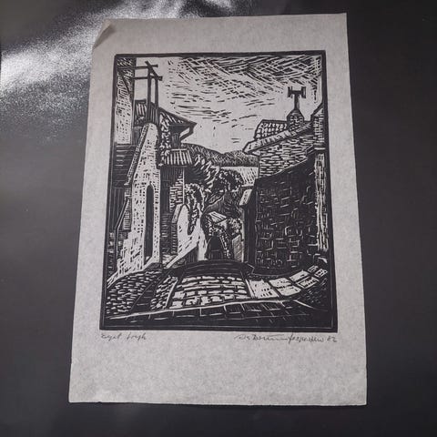 Træsnit, Petter Pettersson:, motiv: ”Døren”.